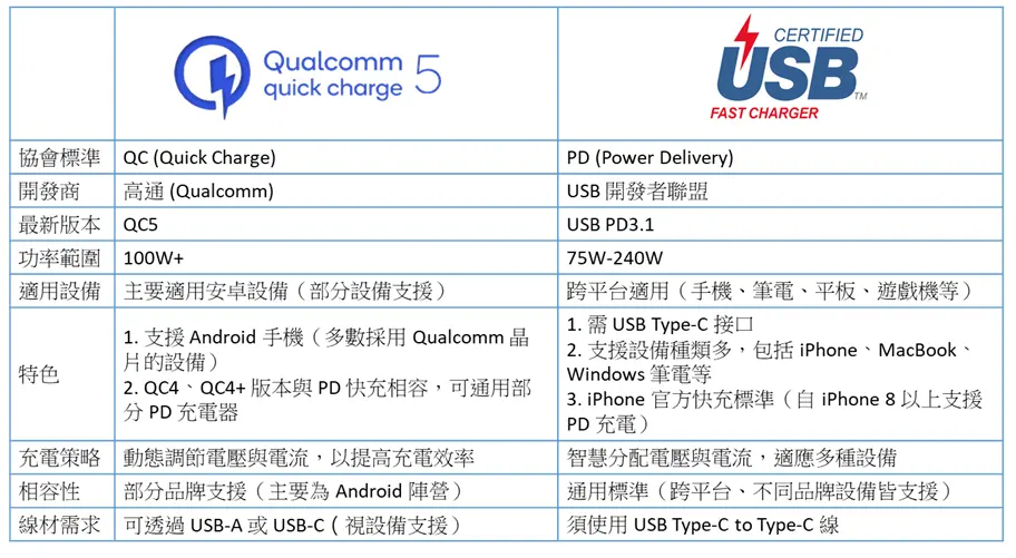 協會標準 | QC (Quick Charge) | PD (Power Delivery) |